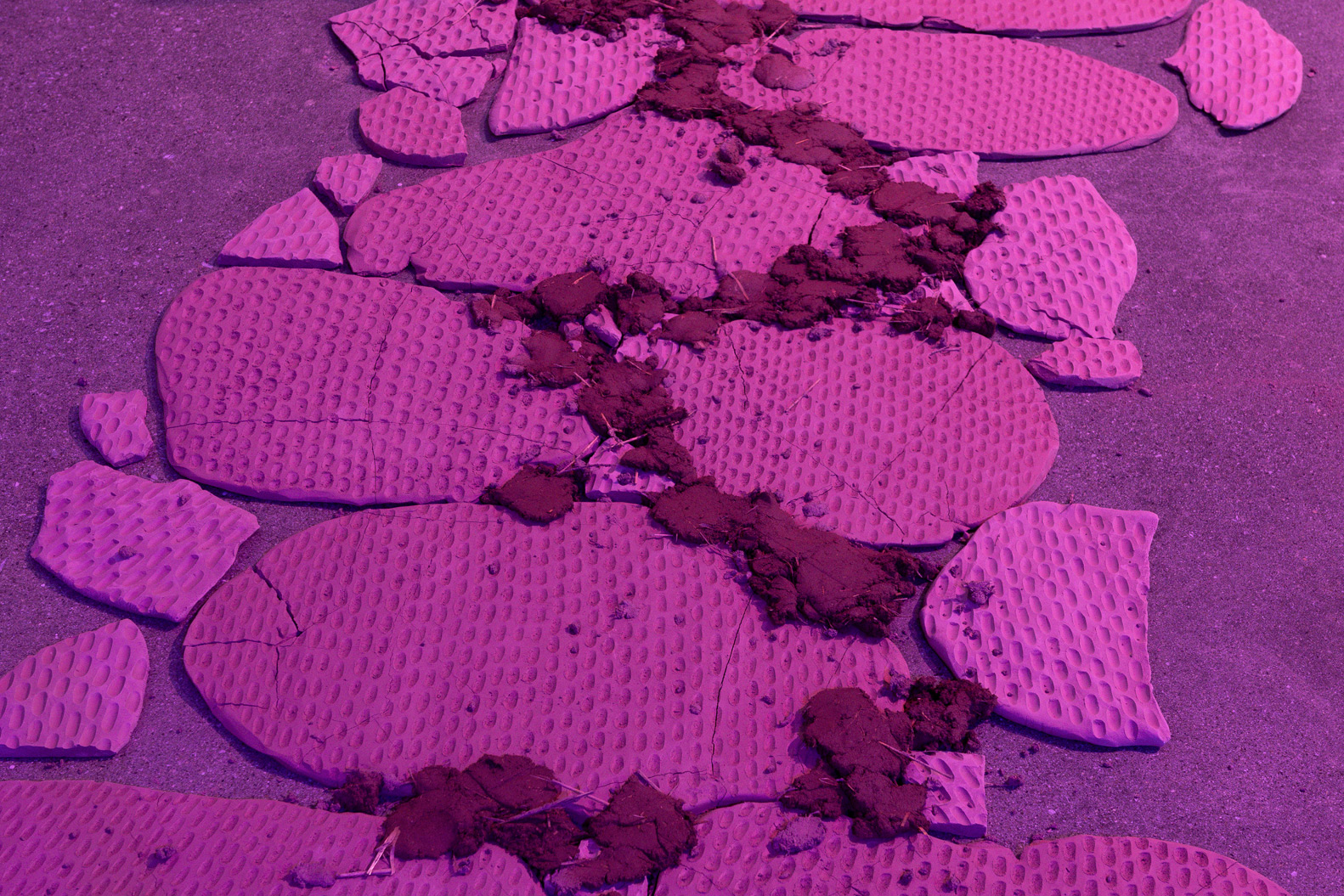 The exhibition delves into these stories and the ideas about land, heritage, and dispossession that they evoke. By traversing layers of history, gestures, and voices, Verviers probes the cracks of a divisive economic system to reinvent forms of “living together.” In order to create a dialogue between them, she uses the actions of churning to make mud bricks, adding fragments of thoughts to them. In the gallery, a reconstructed fragment of the Canadian pavilion at the 1886 Colonial and Indian Exhibition in London holds four videos representing different attempts at creating a dialogue between the personal and the political and perhaps rediscovering the meaning of working together.
